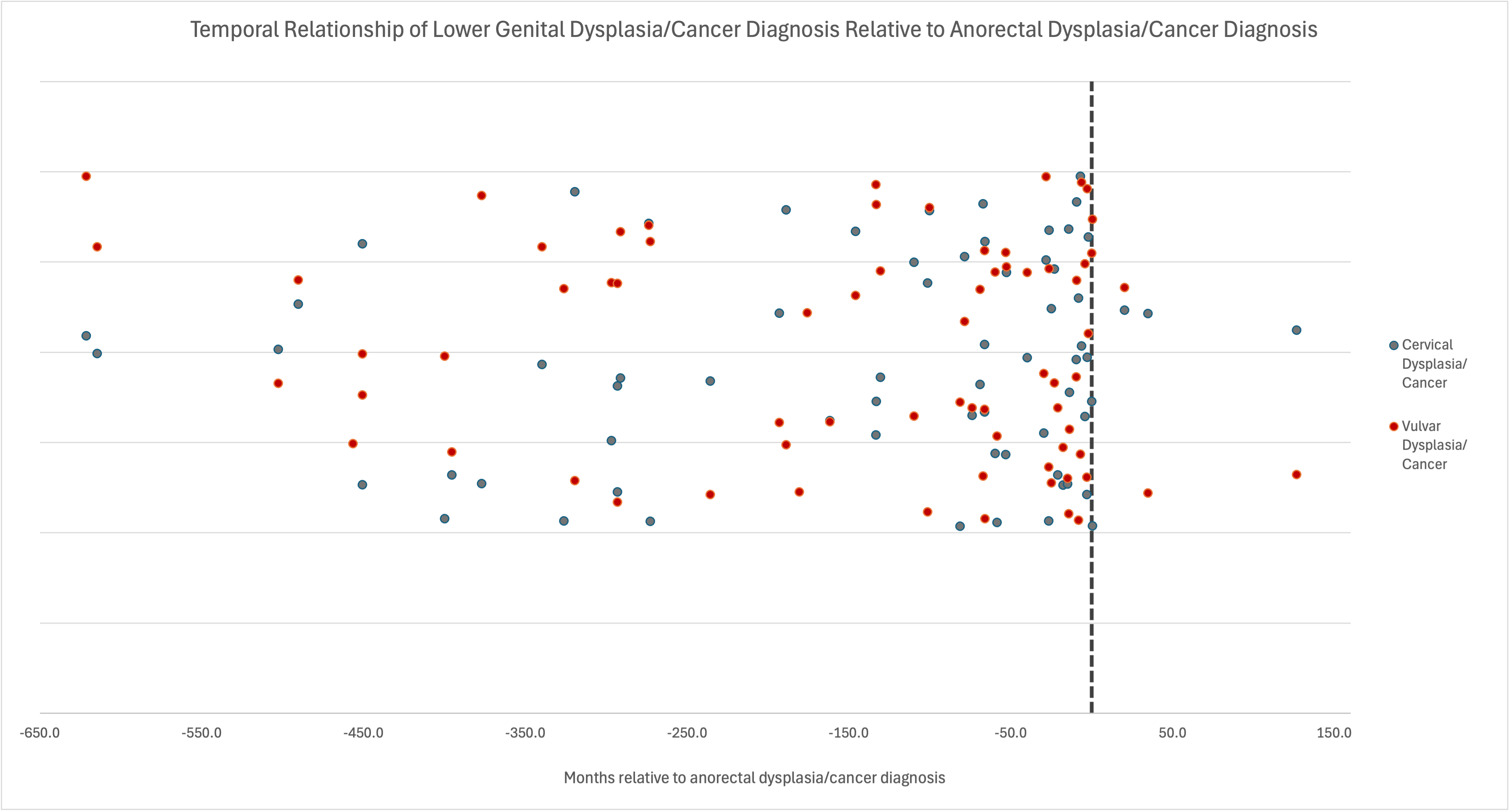 Temporal patterns of lower genital dysplasia/cancer relative to anorectal dysplasia/cancer based on diagnosis date. The dashed line indicates the time of anorectal diagnosis. Negative values denote lower genital diagnoses preceding and positive values denote diagnoses following.