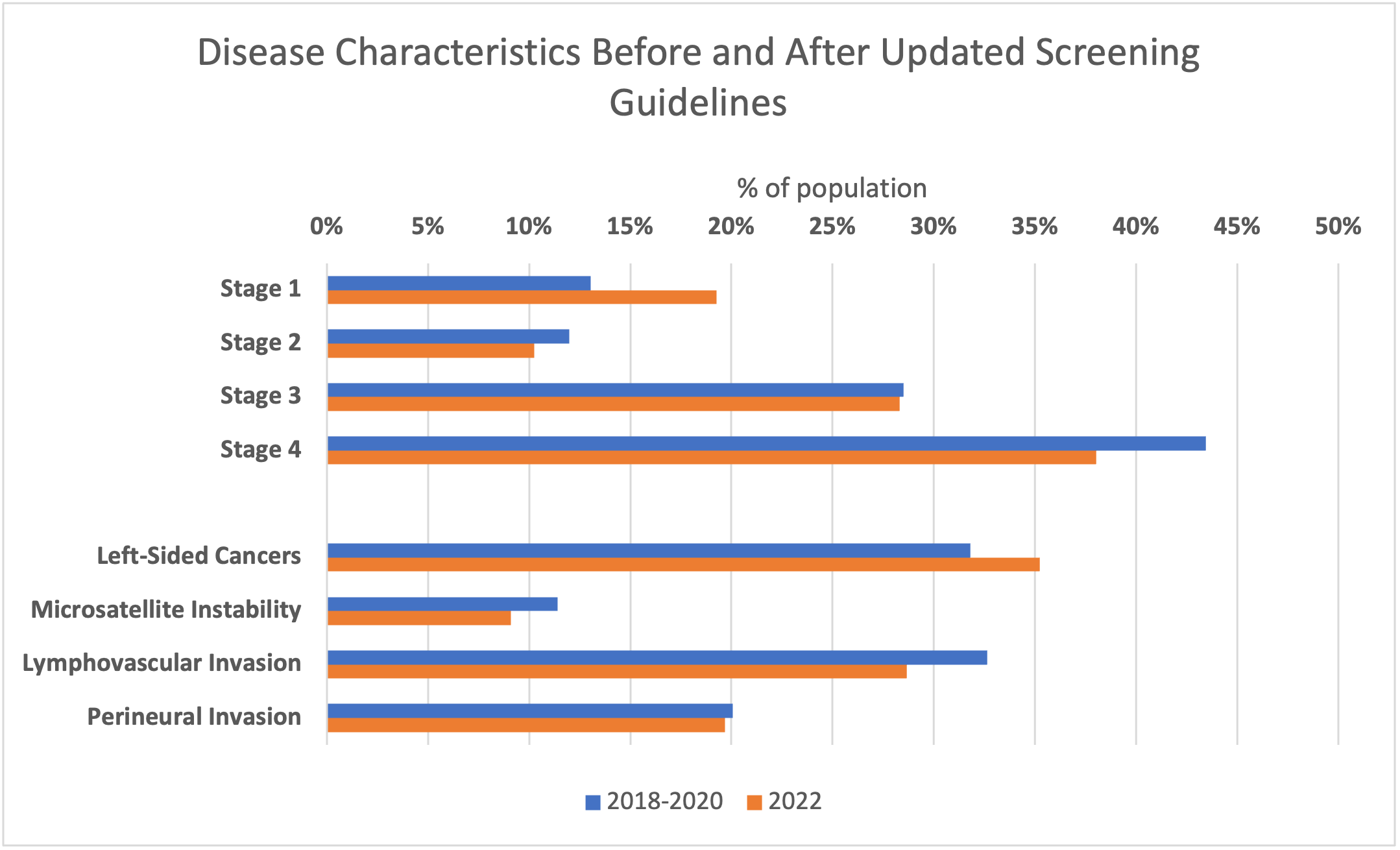 Percent of disease characteristics in patients diagnosed with colorectal cancer in 2018-2020 and in 2022.