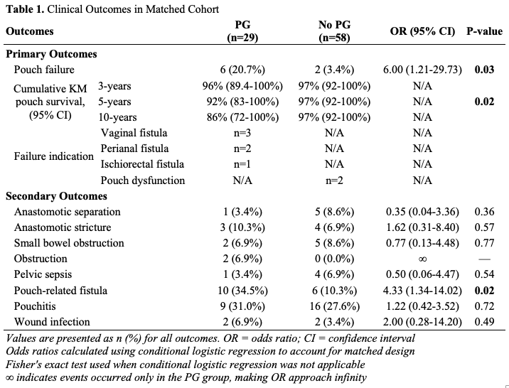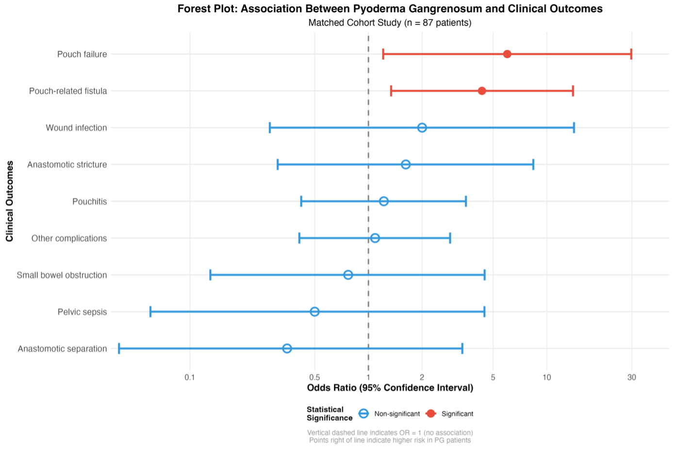 Forest plot showing association between pyoderma gangrenosum and clinical outcomes in matched cohort.