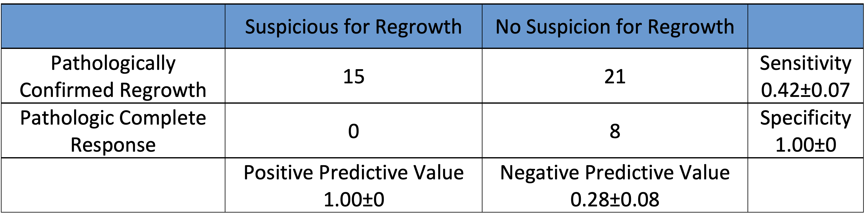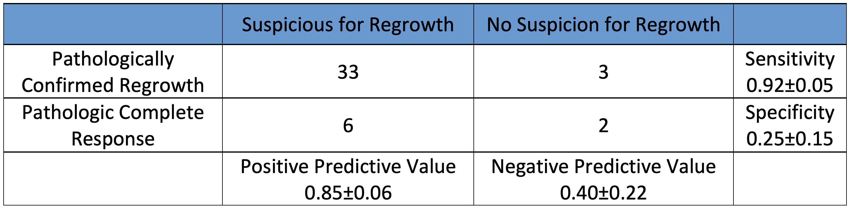 A compilation of the observed sensitivity, specificity, positive predictive value, and negative predictive value of MRI for detecting local regrowth of rectal cancer after TNT.