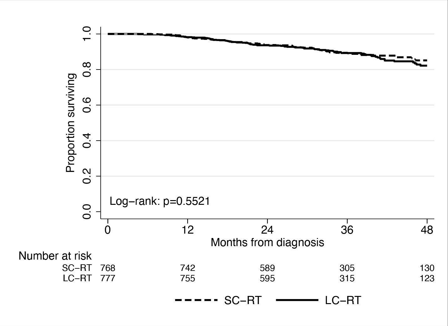 Overall survival of propensity score matched patients truncated at 4 years of follow-up. Log rank p = 0.5521.