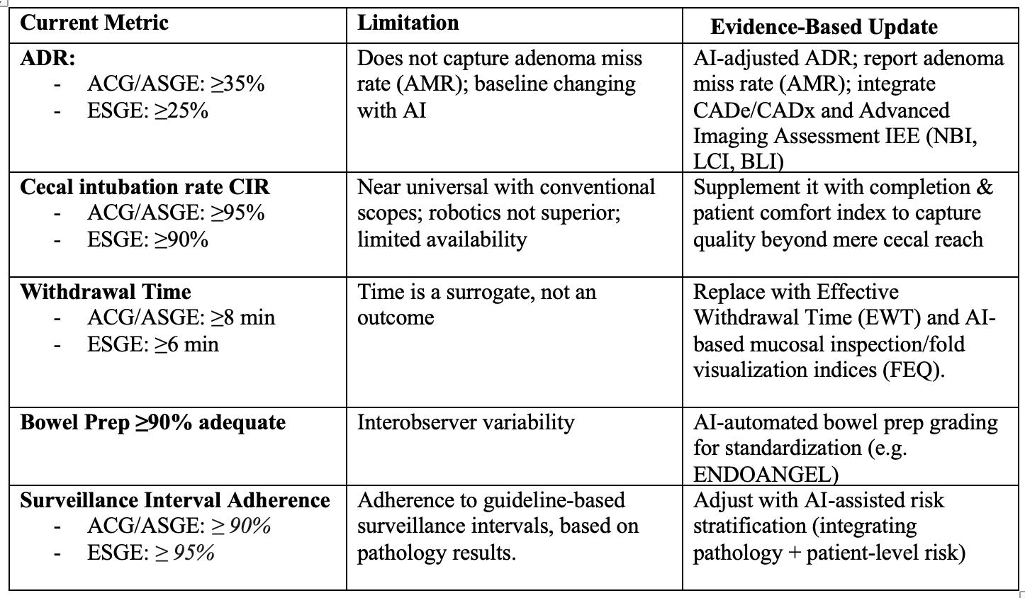 Comparison of current guideline-based colonoscopy quality metrics (ACG/ASGE and ESGE) with proposed evidence-based updates incorporating AI, image-enhanced endoscopy (IEE), and digital standardization tools.