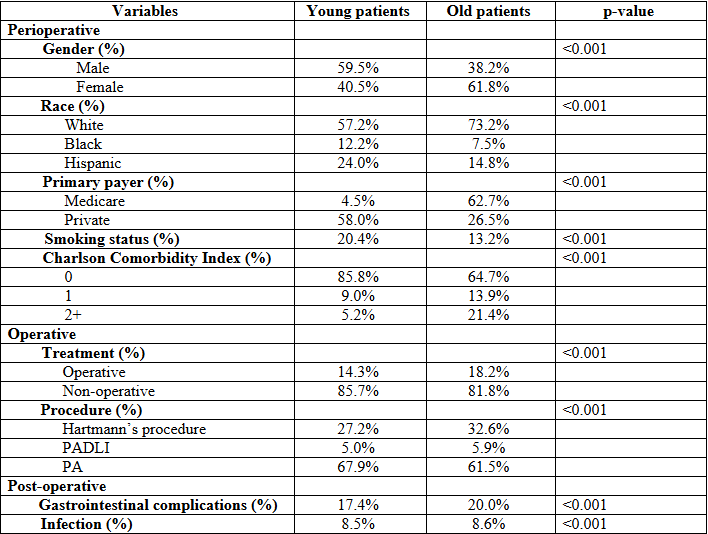 Perioperative, operative, and postoperative characteristics of young vs. old patients with diverticulitis