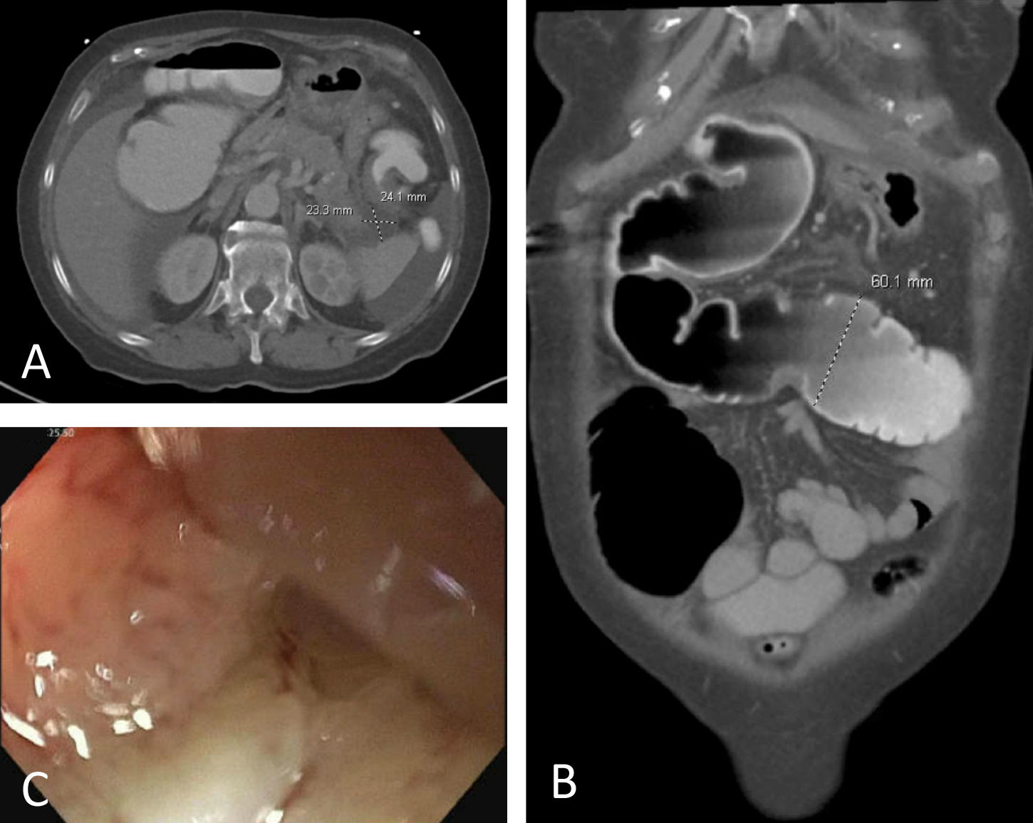CT (A) axial view showing the pancreatic pseudocyst and (B) coronal view showing a dilated cecum and transverse colon. (C) Flexible sigmoidoscopy revealing a malignant-appearing tumor in the rectosigmoid colon, biopsied.