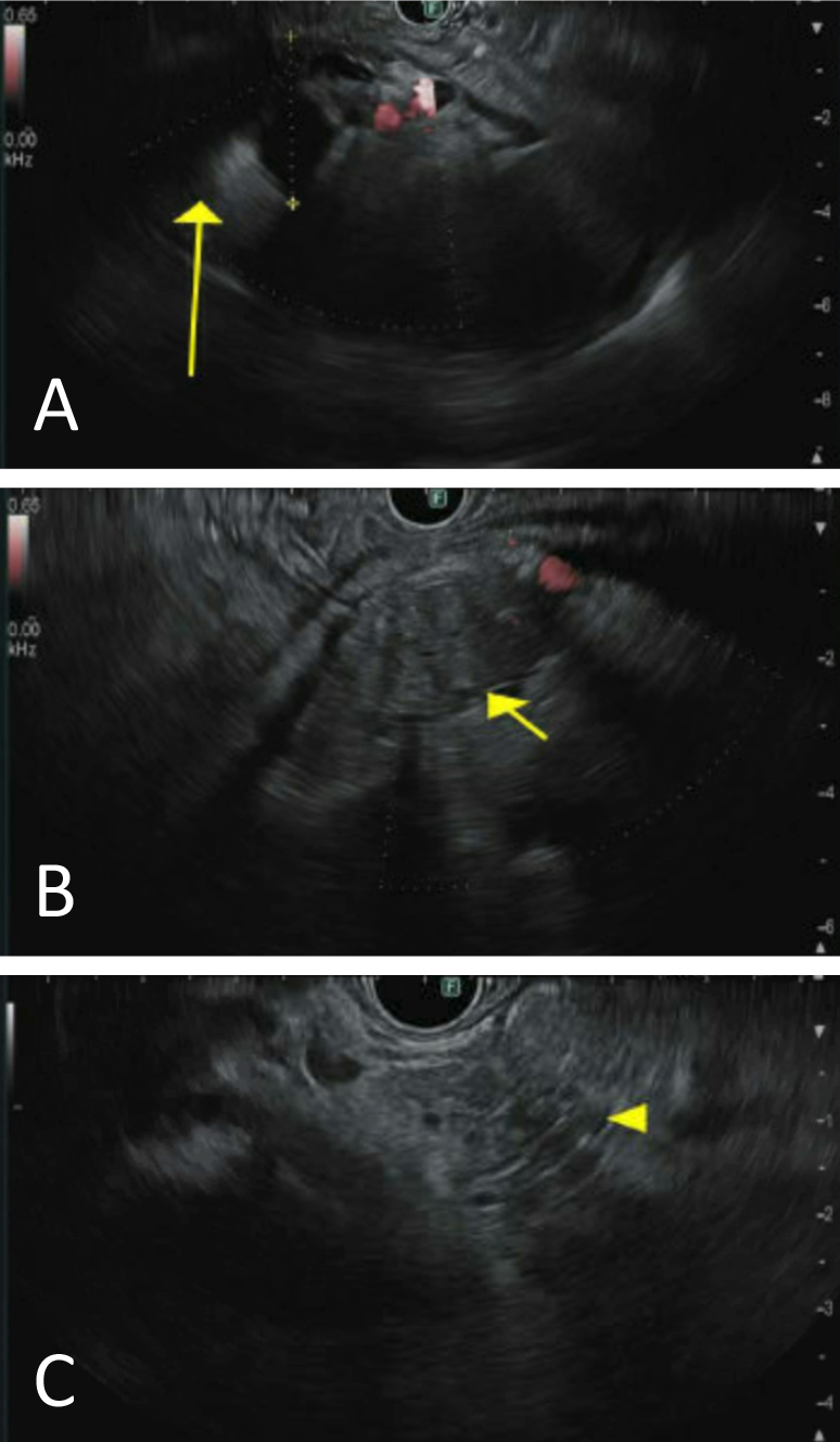 Masses were found in the (A) tail, (B) body, and (C) head of the pancreas.