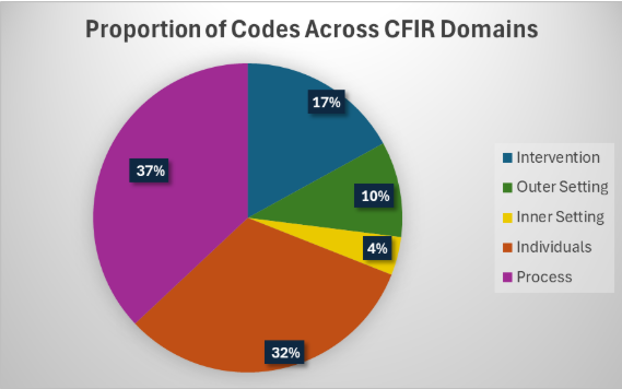 The distribution of codes across 5 Consolidated Framework for Implementation Research (CFIR) domains: intervention, outer settings, inner setting, individuals, and process.