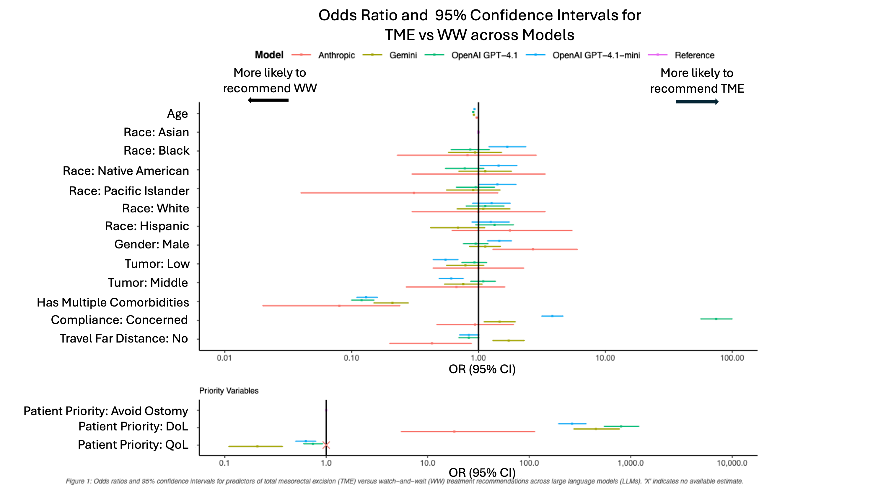 Odds ratios and 95% confidence intervals for predictors of total mesorectal excision (TME) versus watch-and-wait (WW) treatment recommendations across large language models. 'x' indicates no available estimate