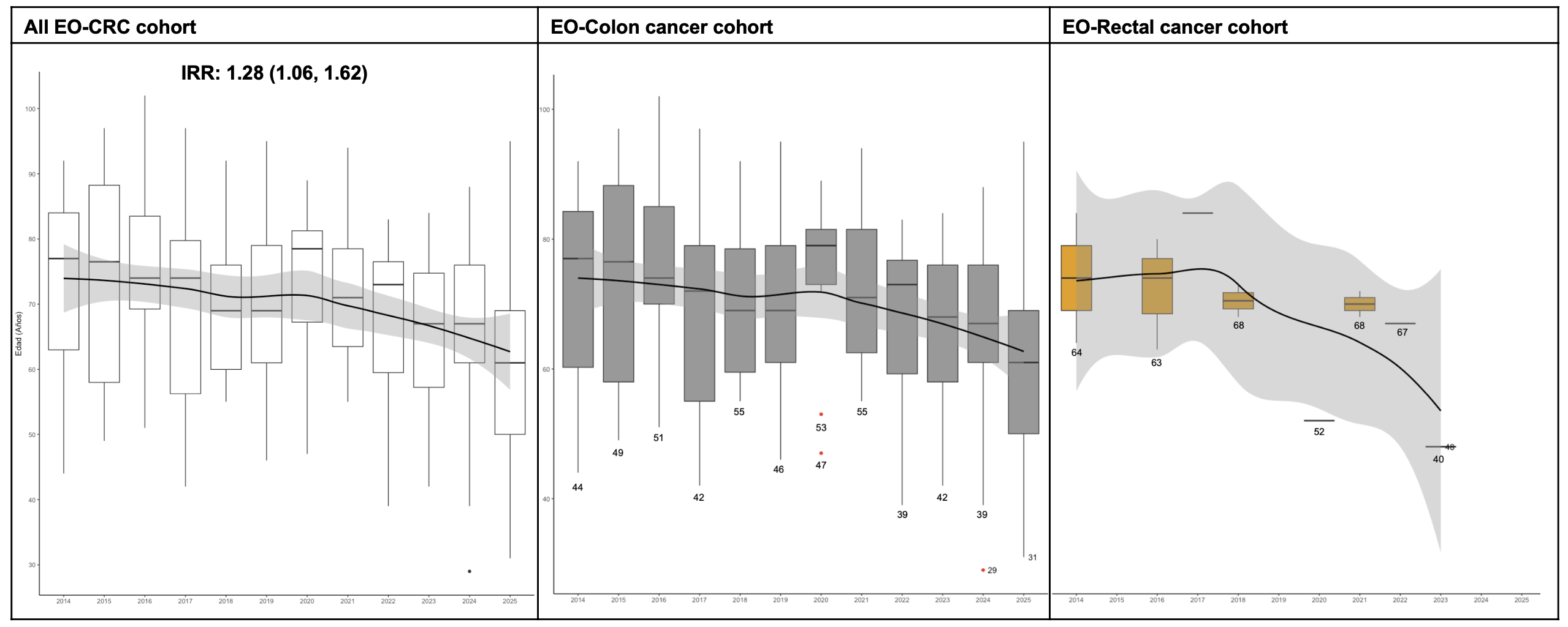Depicted in the first panel is the overall age at diagnosis of all colorectal cancers, and then stratified by colon (Middle panel) and rectal cancer (Last panel).