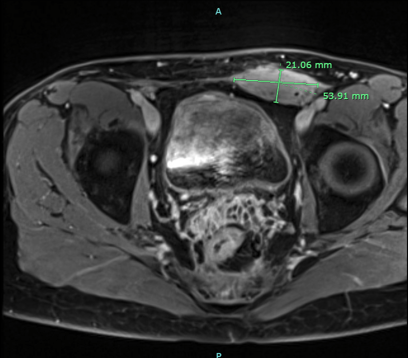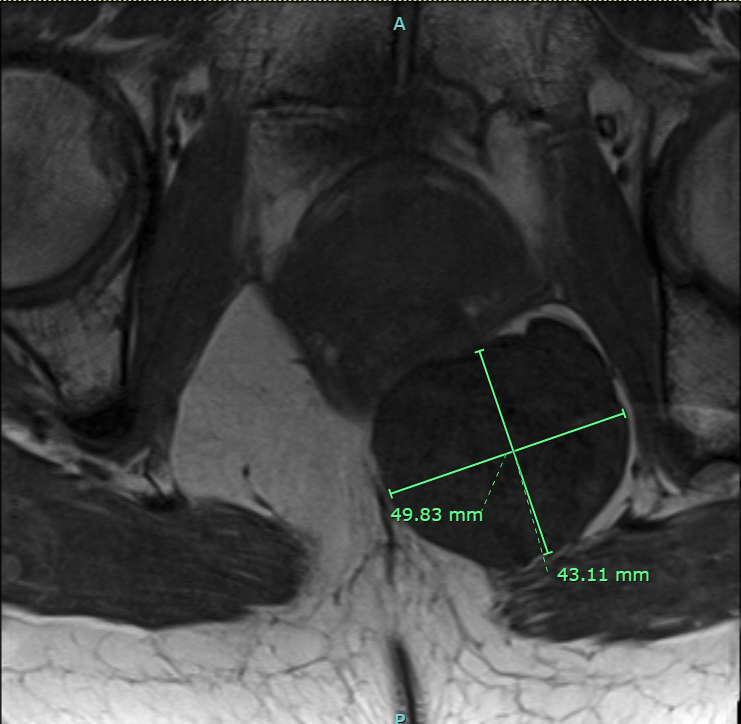 T1 weighted MRI, transverse image of well-circumscribed, low signal tumor along the undersurface of the posterior levator ani muscle.