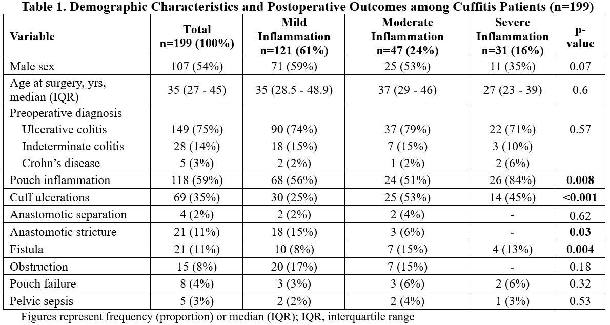 Demographic Characteristics and Postoperative Outcomes among Cuffitis Patients (n=199)