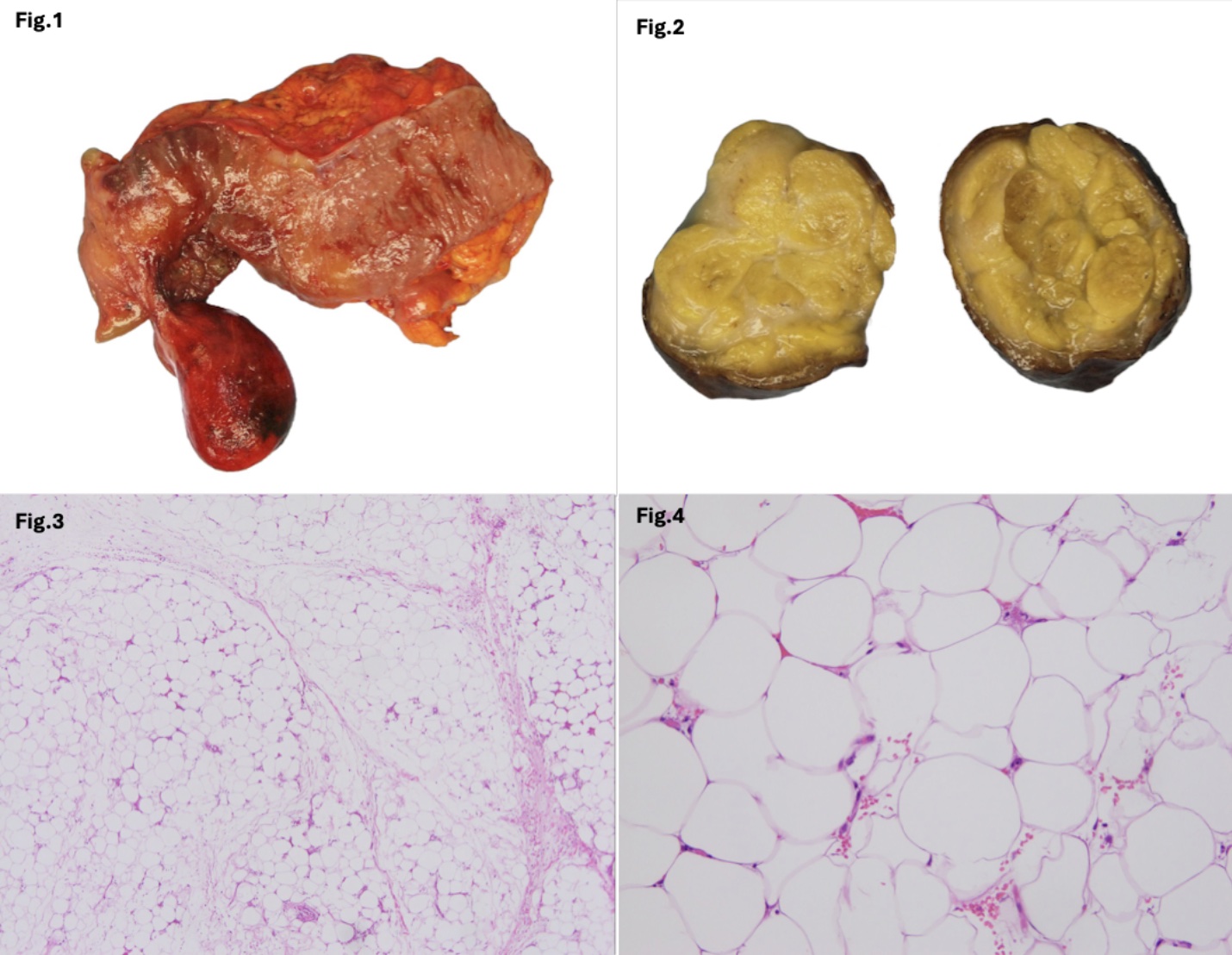 Figure 1. Opened sigmoid colon specimen demonstrating a pedunculated intraluminal polyp measuring 7.5 × 6 × 2.5 cm. The polyp surface is smooth with patchy hemorrhagic discoloration. The stalk is attached to the adjacent mucosal surface. Figure 2. Cut surface of the polyp demonstrating a well-circumscribed, lobulated, homogeneously yellow lesion with a soft, greasy consistency, surrounded by a thin, delicate capsule. Figure 3. Low-power view (H&E, 4×) showing a well-circumscribed lesion composed of lobules of mature adipocytes separated by paucicellular fibrous septa. Figure 4. High-power view (H&E, 20×) demonstrating mature adipocytes without cytologic atypia, lipoblasts, or necrosis.