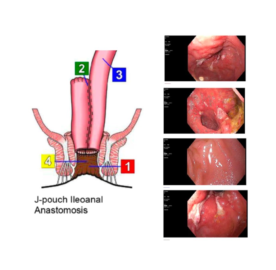 Pouchoscopy in chronological order with active inflammation of the rectal pouch and aphthous ulcerations.