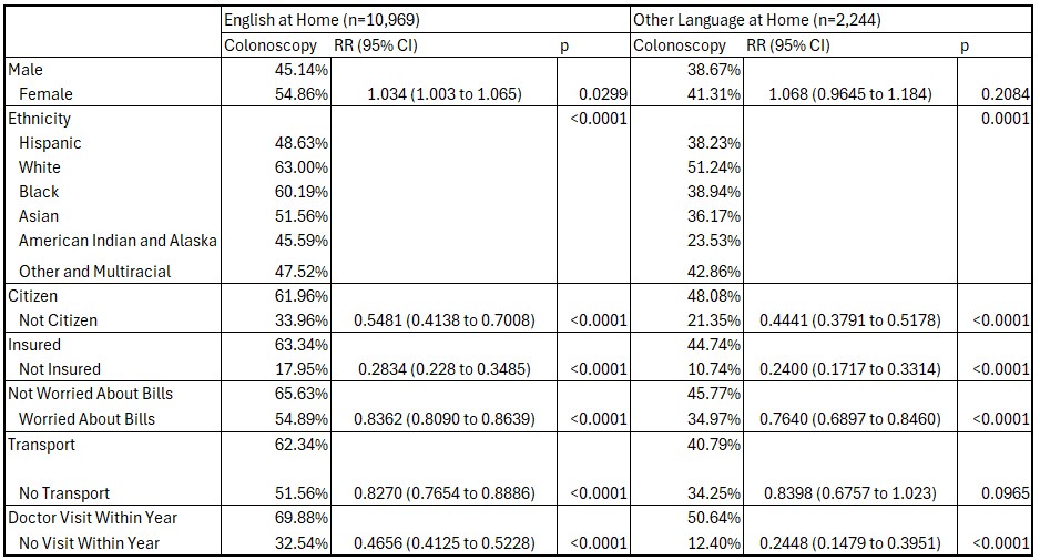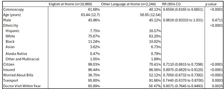 This table shows percent prevalence of the indicated variables among patients who speak English at home or speak another language at home, with colonoscopy indicating colonoscopy screening rate. Age is a continuous variable shown as average in years with standard deviation. Relative risk and p values (p < 0.05 is statistically significant) are also shown.