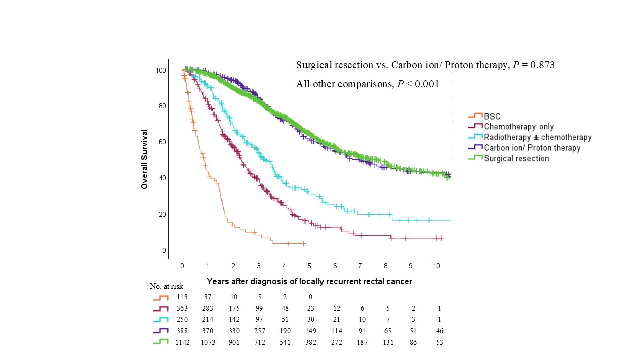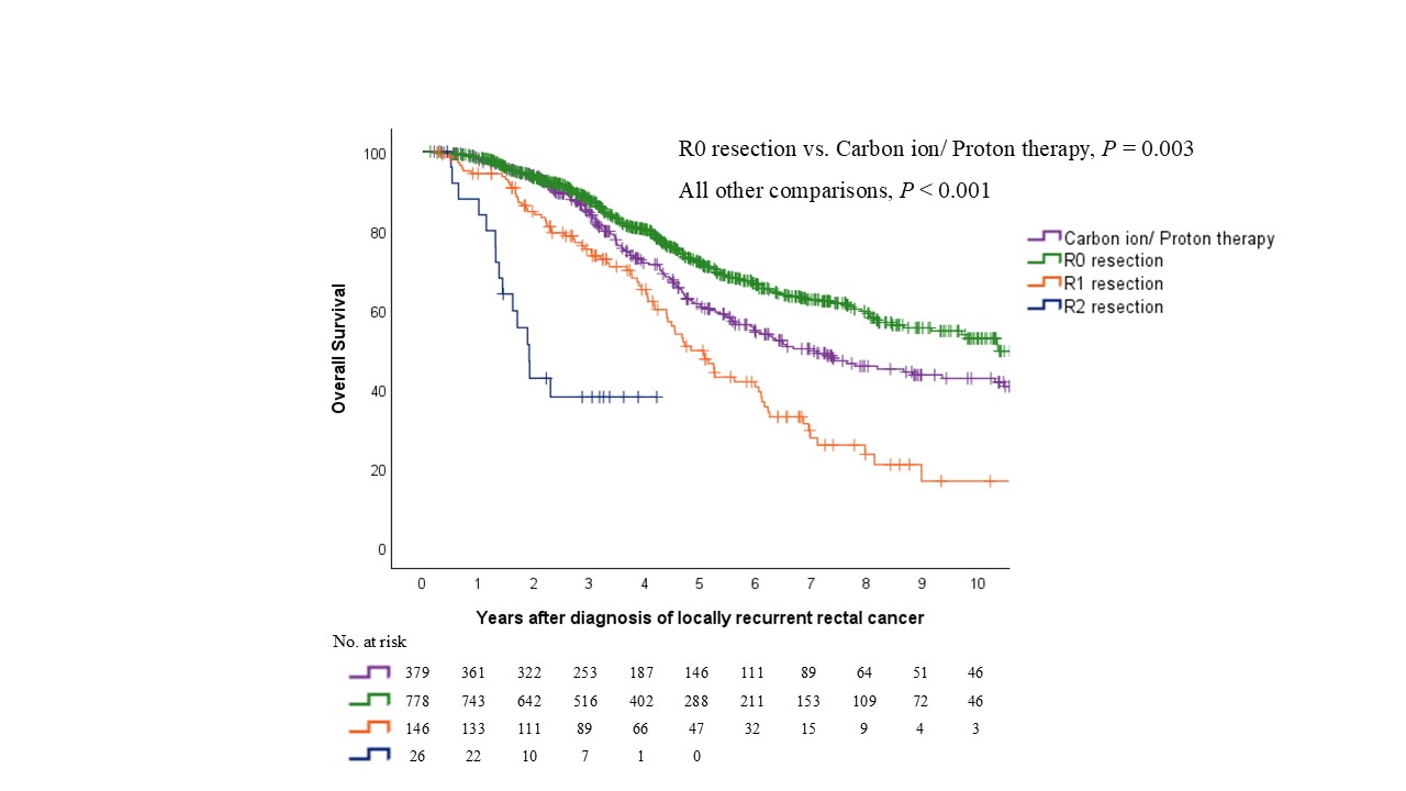 R0 resection was associated with significantly better survival than particle therapy (P = 0.003). All other comparisons also demonstrated significant differences (P < 0.001).