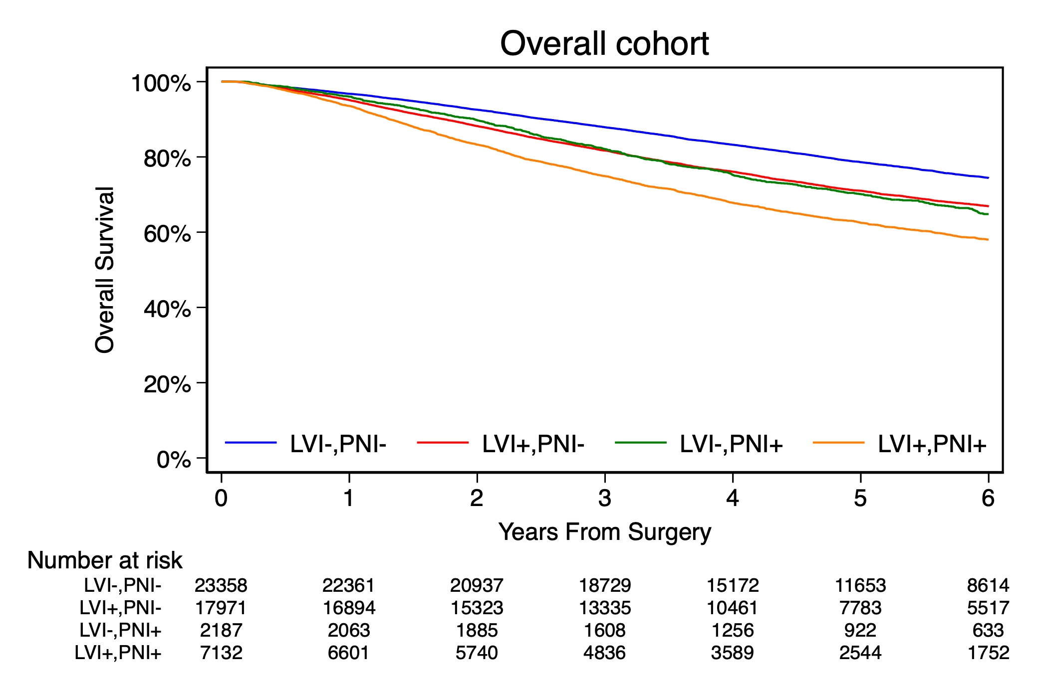 Data cutoff occurred at 6 years after surgery. Abbreviations: LVI, lymphovascular invasion; PNI, perineural invasion.