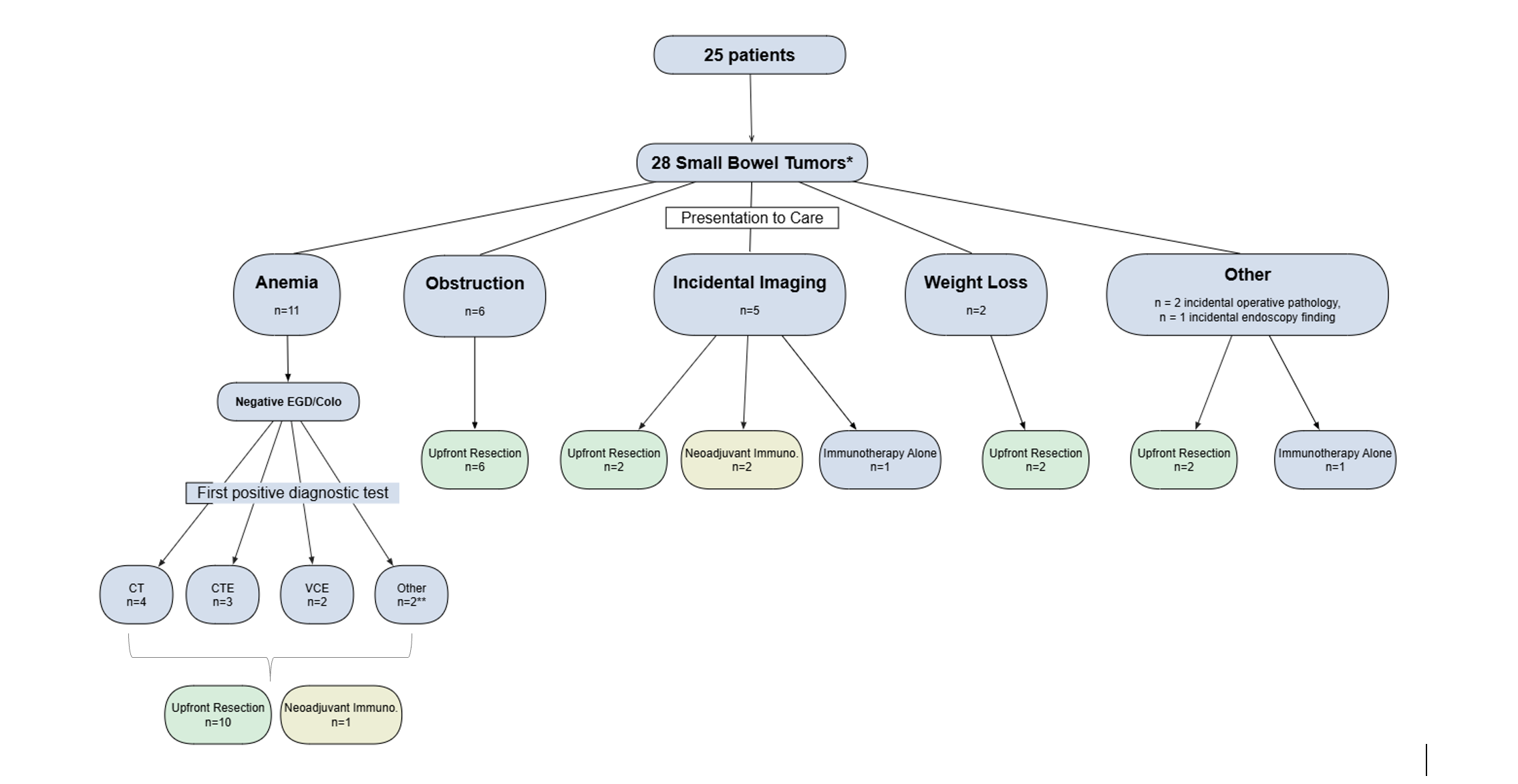 All patients receiving immunotherapy were treated with PD-1 inhibitors. Diagram created using yEd Graph Editor (yWorks, www.yworks.com). CT = computed tomography, CTE = CT enterography, VCE = video capsule endoscopy, EGD = esophagogastroduodenoscopy, immuno. = immunotherapy.