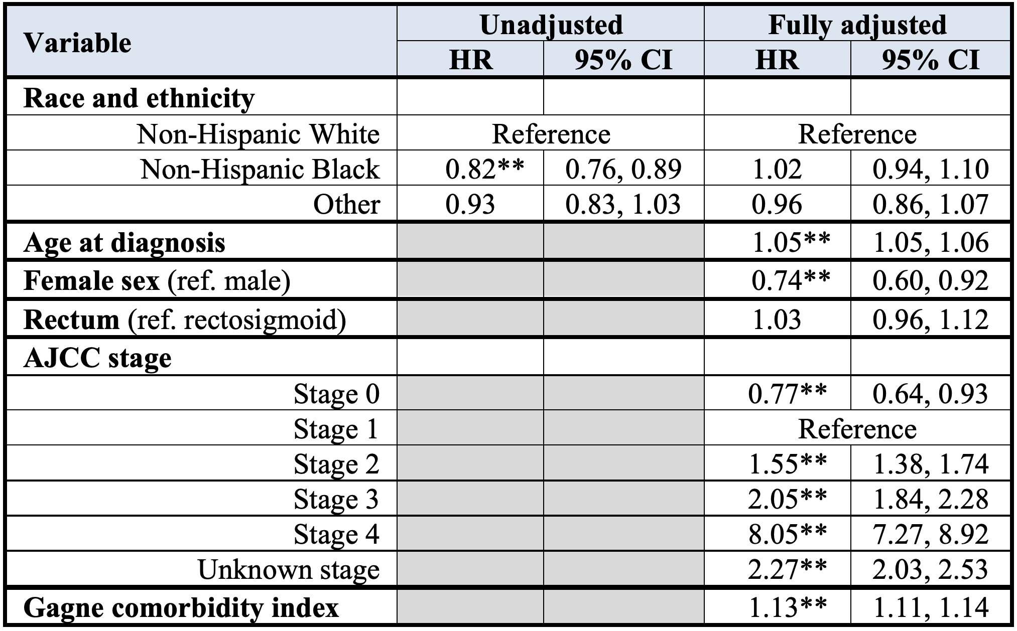 ** p < 0.01; AJCC, American Joint Committee on Cancer; CI, confidence interval; HR, hazard ratio; ref, reference