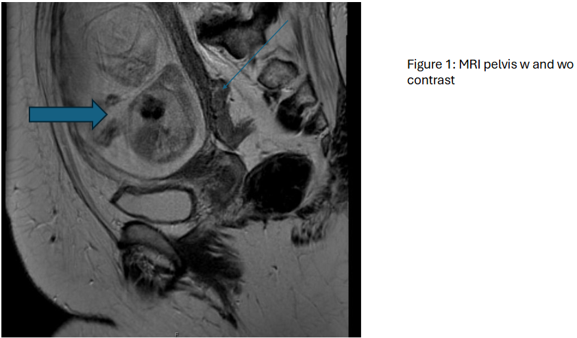 Caption; MRI pelvis, thin blue arrow represents rectal mass, thick blue arrow represents fetus.