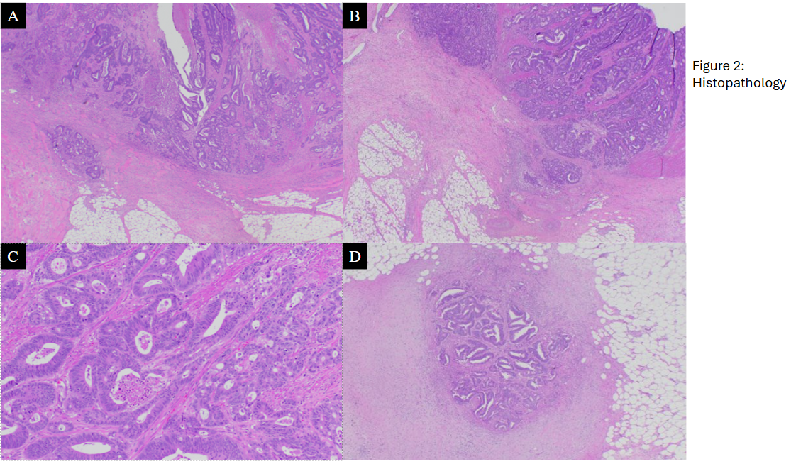 Histologic sections show residual adenocarcinoma (C) invading through the muscularis propria and into the pericolorectal tissue (A-B). Two separate tumor deposits were identified (D).