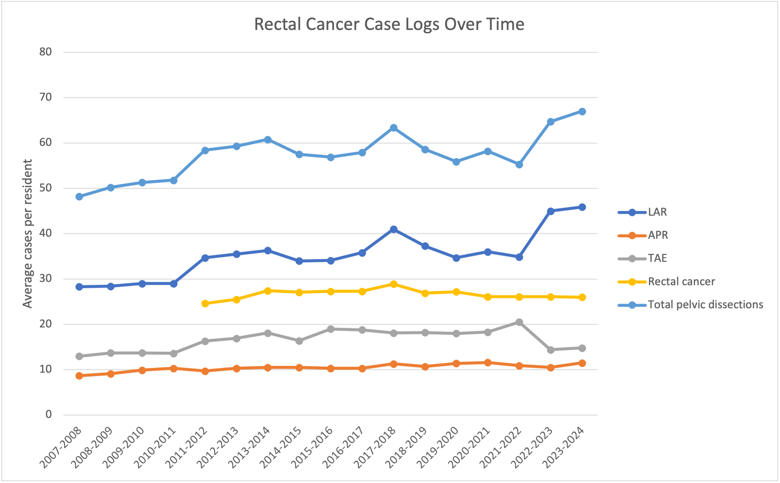 Colorectal surgery resident case logs of rectal cancer-related cases over time, including low anterior resection (LAR), abdominoperineal resection (APR), transanal excision (TAE), rectal cancer, and pelvic dissection cases.