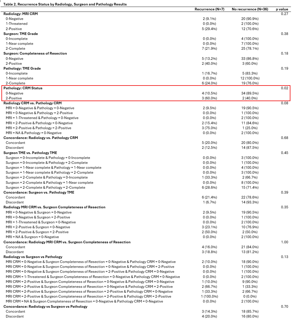 Illustrates recurrence status based on radiology CRM status, Surgeon TME grade, Surgeon Completeness of resection, Pathology TME grade, Pathology CRM status. Also shows recurrence status based on concordant findings between pathology, radiology, and surgery.