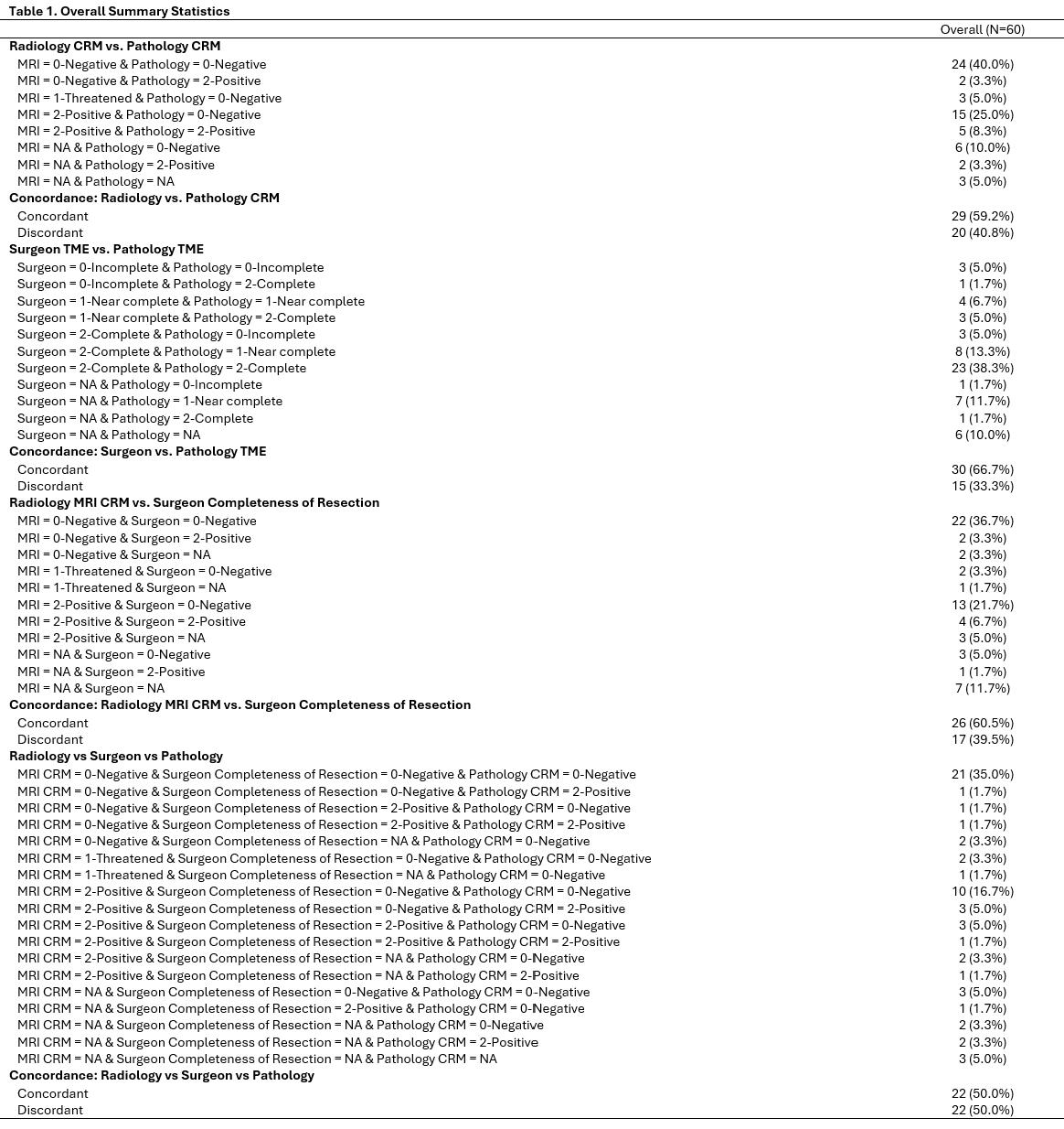 Overall summary of statistics demonstrating concordant findings between Radiology CRM and Pathology CRM, Surgeon TME and Pathology TME, Radiology MRI CRM and Surgeon completeness of resection, and Radiology, Surgery, and Pathology findings.