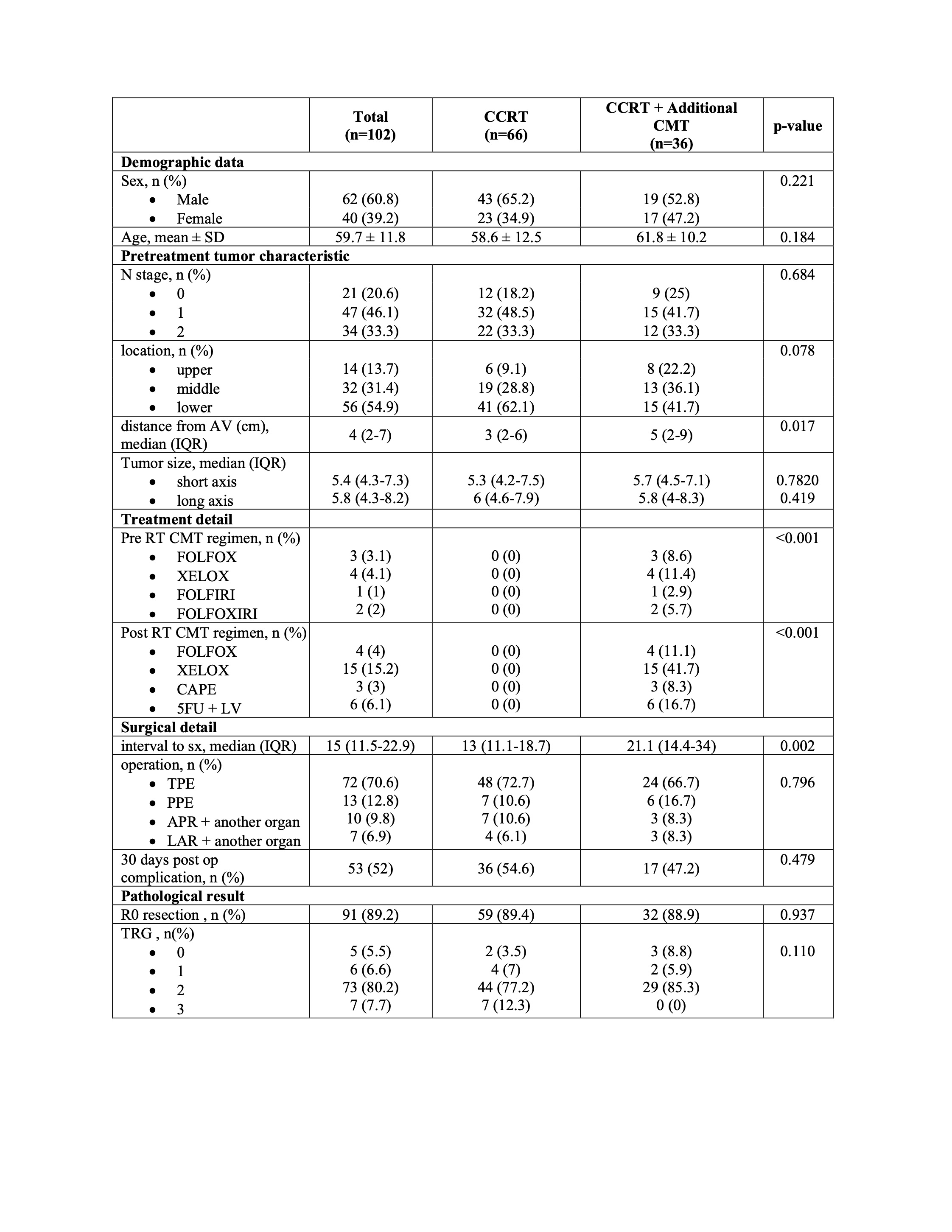 This table shows a brief summary of demographic characteristics, pretreatment tumor characteristics, treatment details, surgical details, and pathological results.