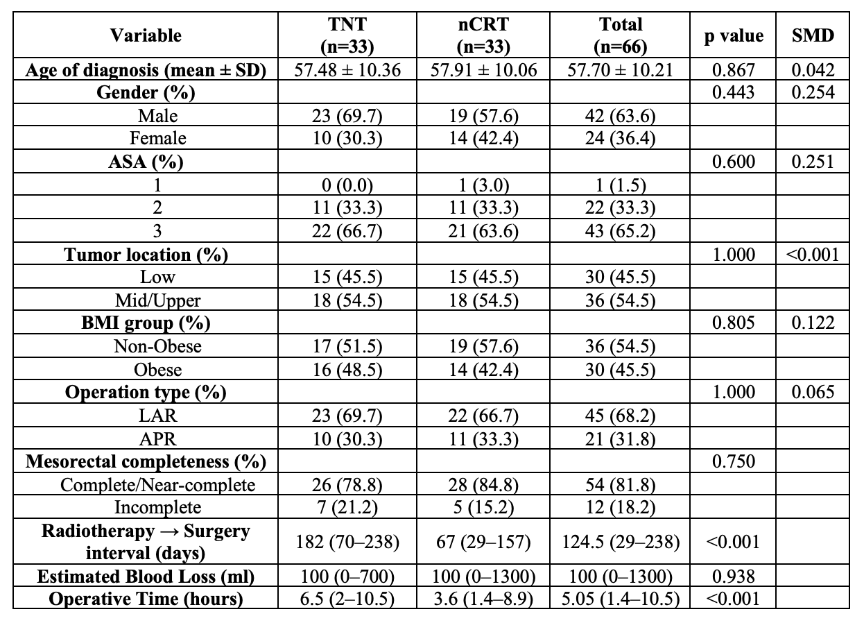 Table 1: Baseline Characteristics and Completeness of Mesorectal Excision in the Propensity-Matched Cohorts of Total Neoadjuvant Therapy (TNT) and Traditional Neoadjuvant Chemoradiotherapy (nCRT)