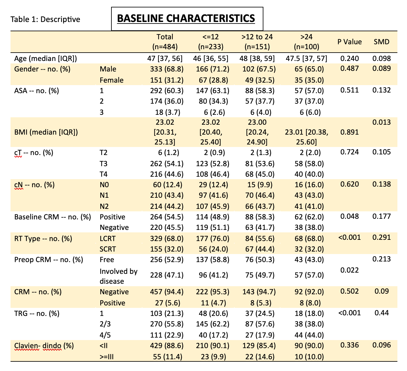 Table shows the study population was equally distributed across all 3 groups with age, sex, clinical tumour (cT) and clinical node (cN) status. Standard mean difference (SMD) was used to analyse and propensity matching done 1:1:1