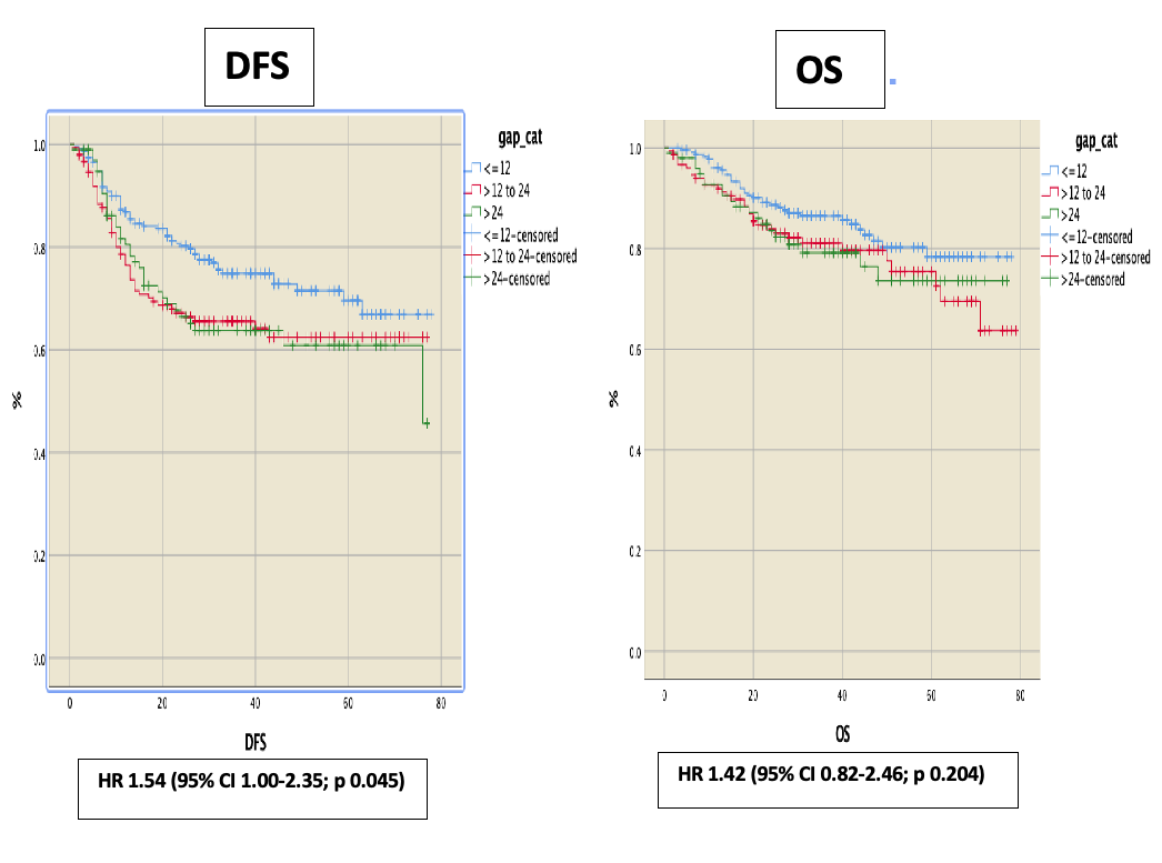 The left side shows the Kaplan Meir curve for DFS, 5 yr DFS in <12 week, 12-24 and > 24 weeks being 70%, 64% and 60%.