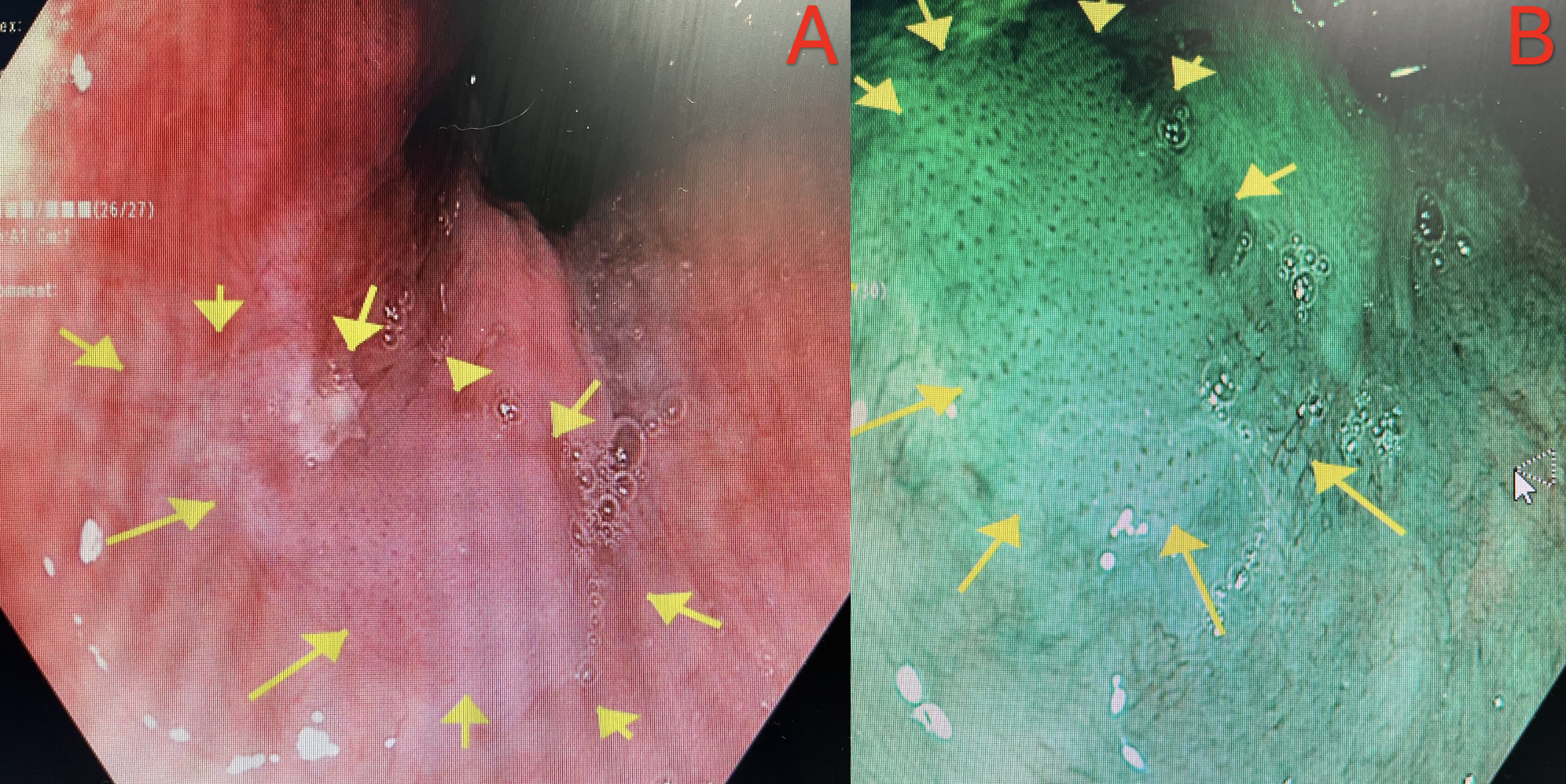 A, slightly raised areas of thickened distal rectal mucosa. B, irregular blood vessel mosaic appearance of the mucosa during retroflexion using narrow-band imaging, Pathology revealed it as AIN III in immunocompetent patient.